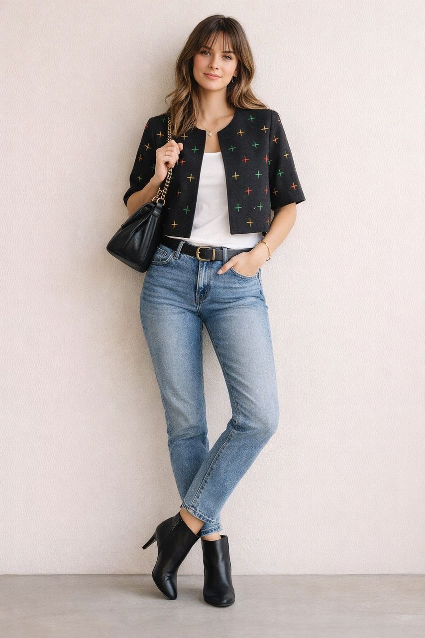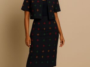 A statement cropped jacket crafted from premium handwoven Aṣọ Òkè, finished with delicate multicolour embroidery. Designed to be worn on its own or styled with the Asa Nova Skirt as a coordinated two-piece. Versatile, polished, and effortlessly distinctive.