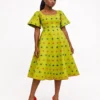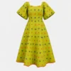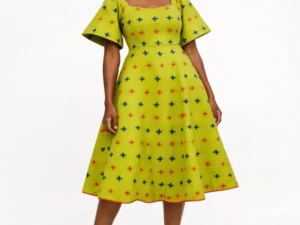 Made from hand-woven aso-oke, this dress combines sculptural structure with soft femininity. The bodice is gently shaped, balanced by statement sleeves and a flowing A-line skirt.