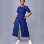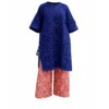 Cut in a rich indigo batik fabric, the tunic falls in a clean, architectural silhouette with wide statement sleeves and a softly structured drape. It is paired with bold red palazzo culottes in a contrasting geometric print, creating a striking yet balanced interplay of colour and pattern.