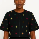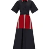 Our bestselling Oriki Dress returns with a striking new update. Crafted from rich navy polished cotton, this refined midi-length silhouette features a flattering wrap-style bodice and a structured collar for elevated edge. Signature Aso Oke inserts in vibrant red with vertical woven stripes bring bold cultural flair, while the cinched waist ensures a flattering fit. Designed to move seamlessly from day to evening, the Oriki Dress blends tradition and modernity—and yes, she’s got pockets.