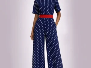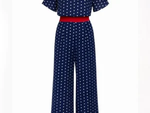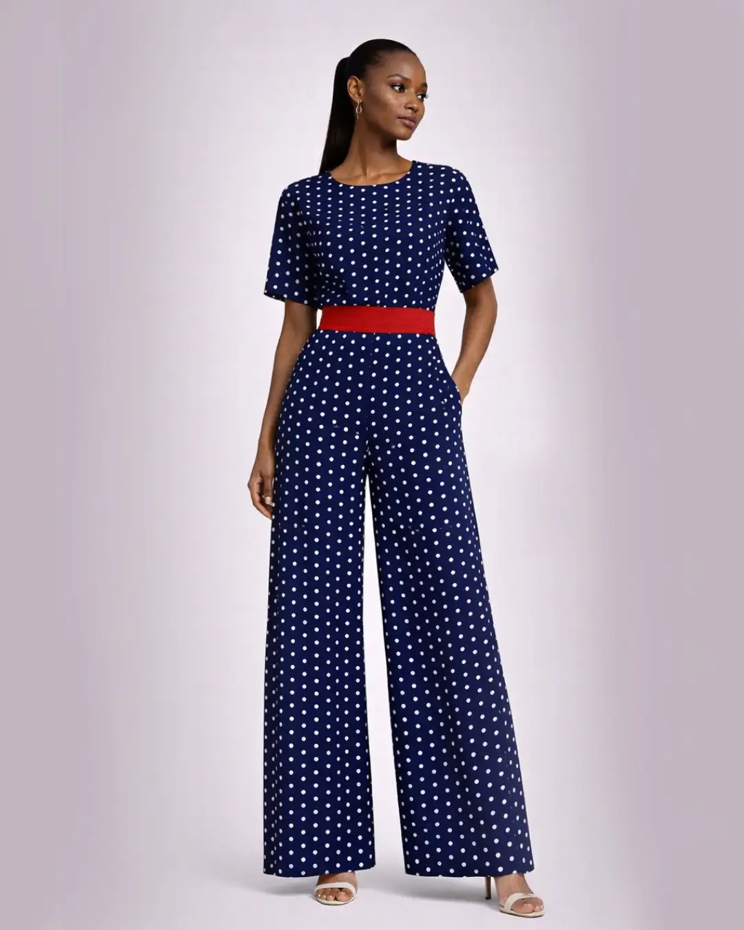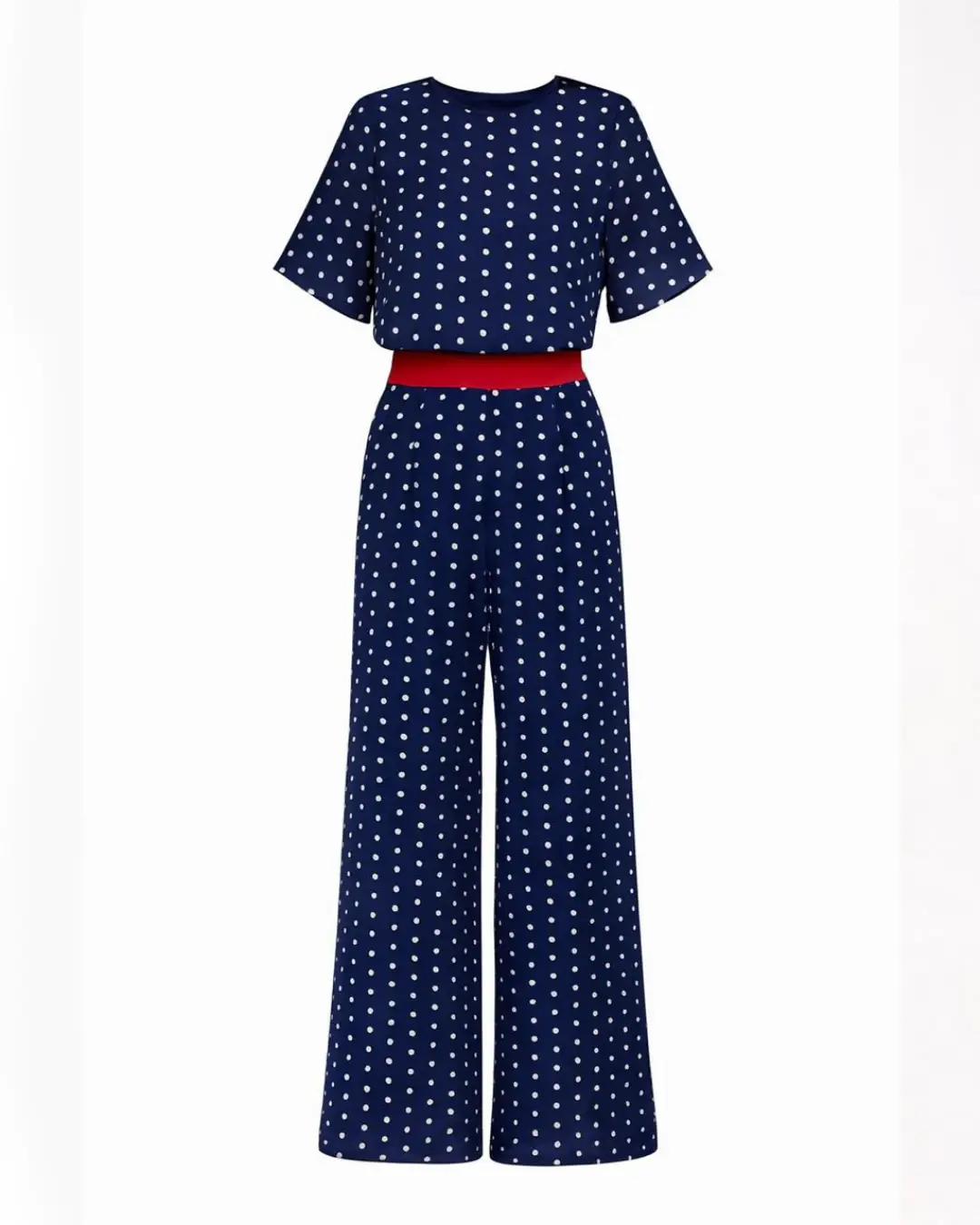 The Sarafina Set is a timeless two-piece ensemble featuring a relaxed-fit top and flowing wide-leg trousers. Cut from premium crepe in a classic navy polka-dot print, it offers effortless elegance with a playful twist.