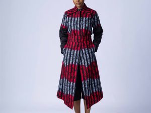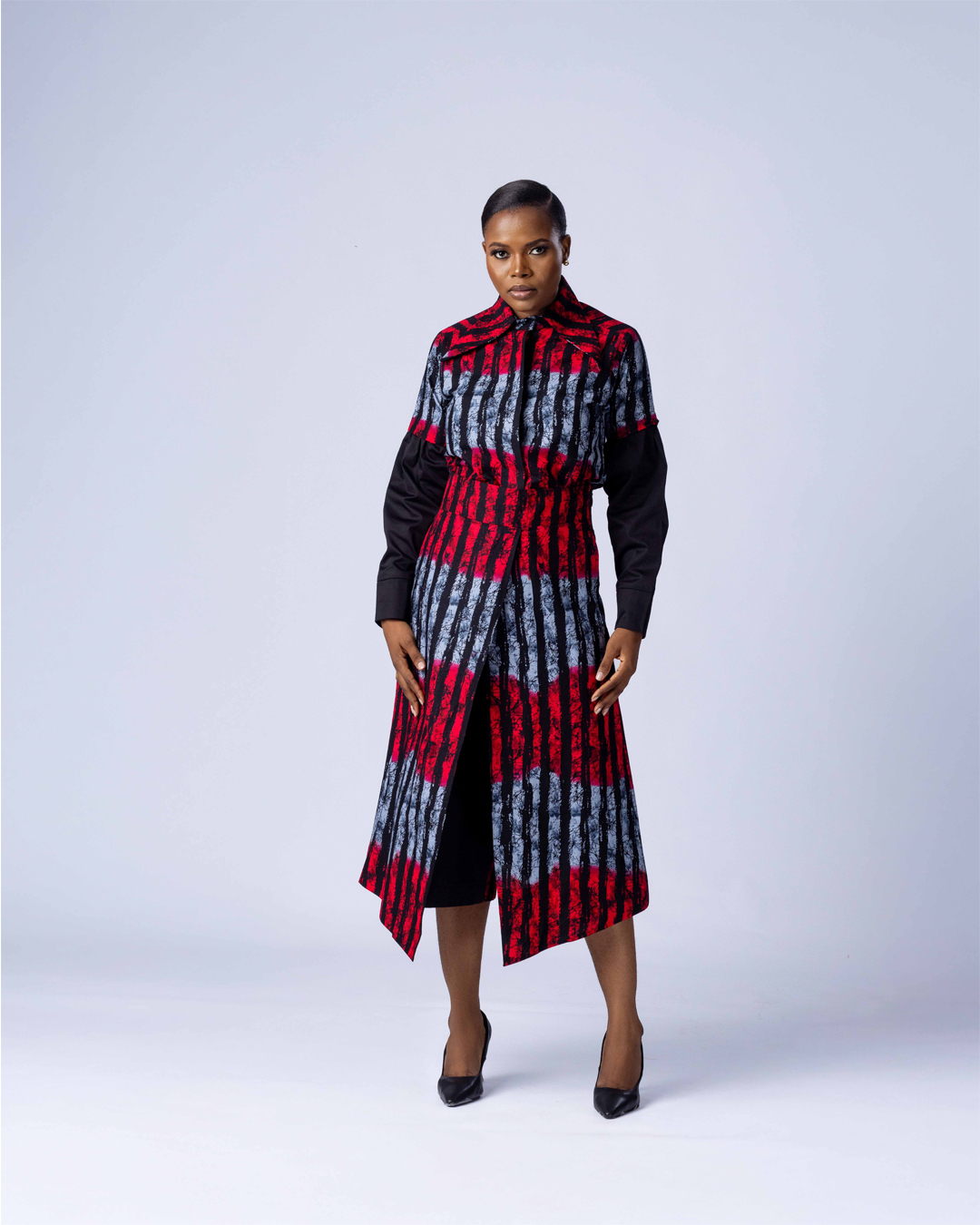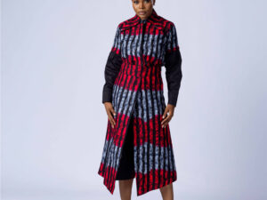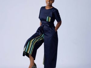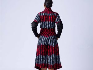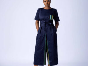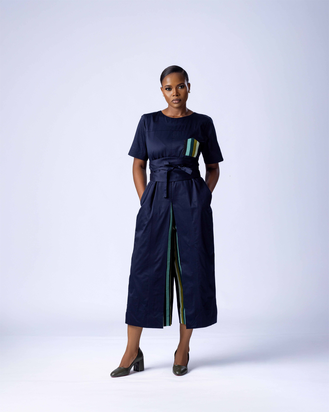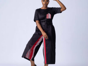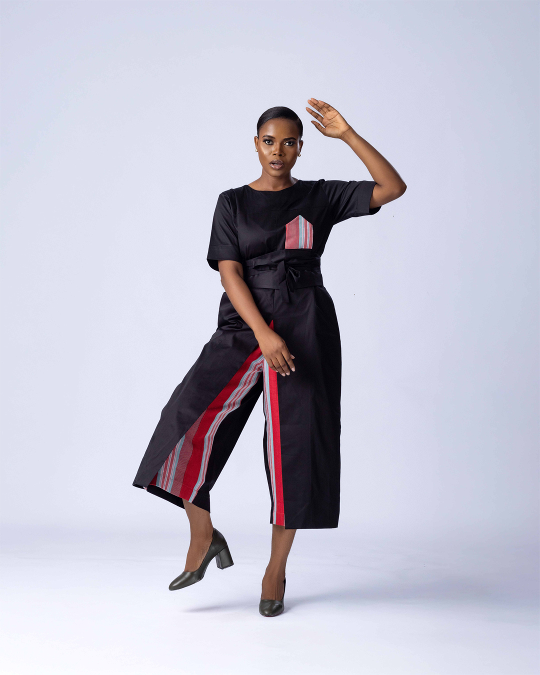 Command attention with this striking design that blends structure and cultural richness. The bold silhouette features a tailored bodice, crisp front pleat, and trouser legs lined with vibrant African Aso-oke—a traditional handwoven fabric known for its beauty and heritage. Finished with a wide cotton belt, this outfit transitions effortlessly from boardroom power dressing to evening sophistication.