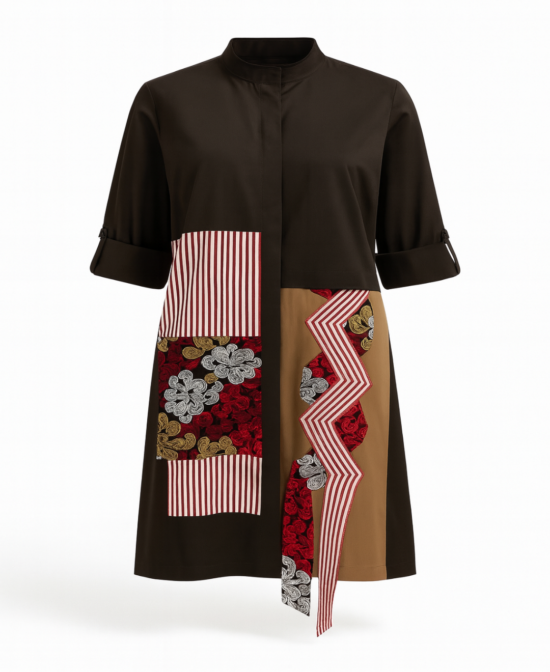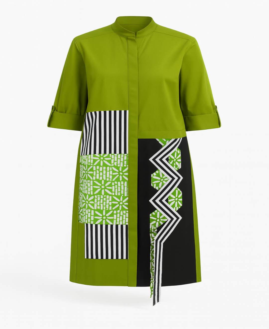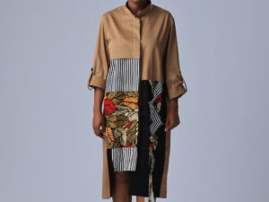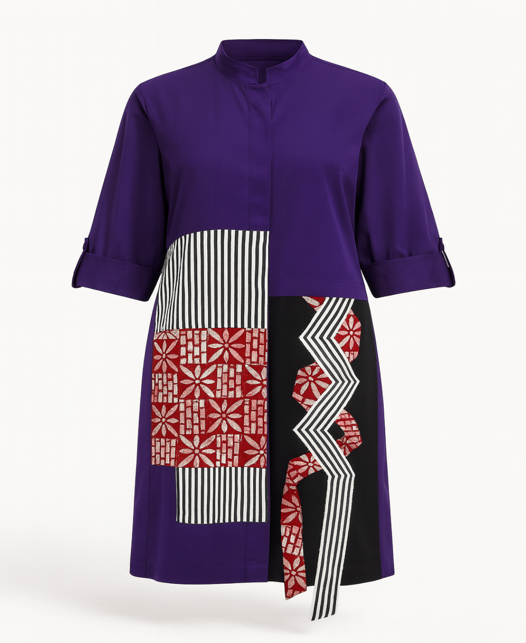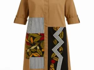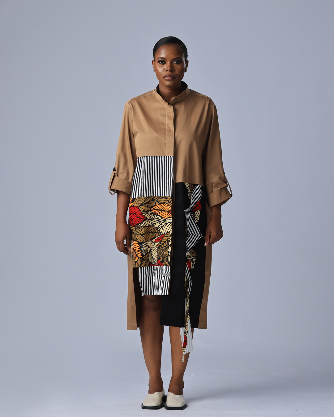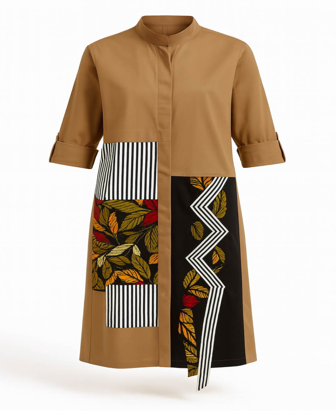 Step into effortless style with the Shero Dress, a modern take on a structured silhouette. Designed with a clean button-down front that stops above the hemline for a relaxed, easy finish, this piece blends form with function beautifully. What truly sets the Shero Dress apart is its uniqueness—no two are alike. Each dress features individually selected African prints and hand-picked cotton fabrics across the front panel and hemline, creating a wearable work of art. From casual days to elevated moments, this dress is your go-to for distinctive, expressive fashion.