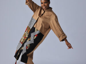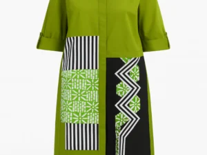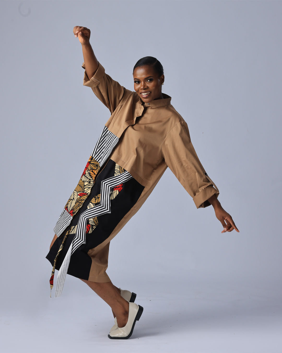 The Shero Dress offers a modern, structured silhouette with a relaxed button-front finish. Each piece is one-of-a-kind, featuring unique African prints and hand-picked cotton fabrics.